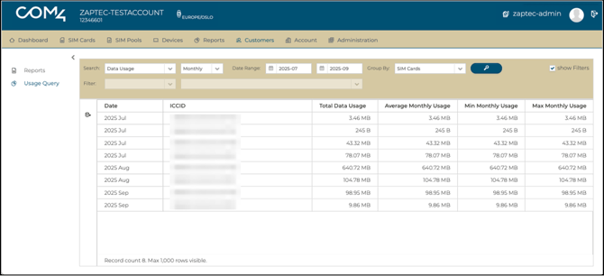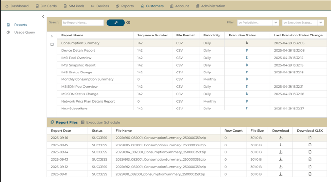 Usage queries allow users to instantly create reports on data for all available SIM cards within their organizational hierarchy level. Users can define the time range and grouping of results using the tool and filter by criterias. Reports can be downloaded immediately in CSV or XLS format, but are not saved for future access in the portal.